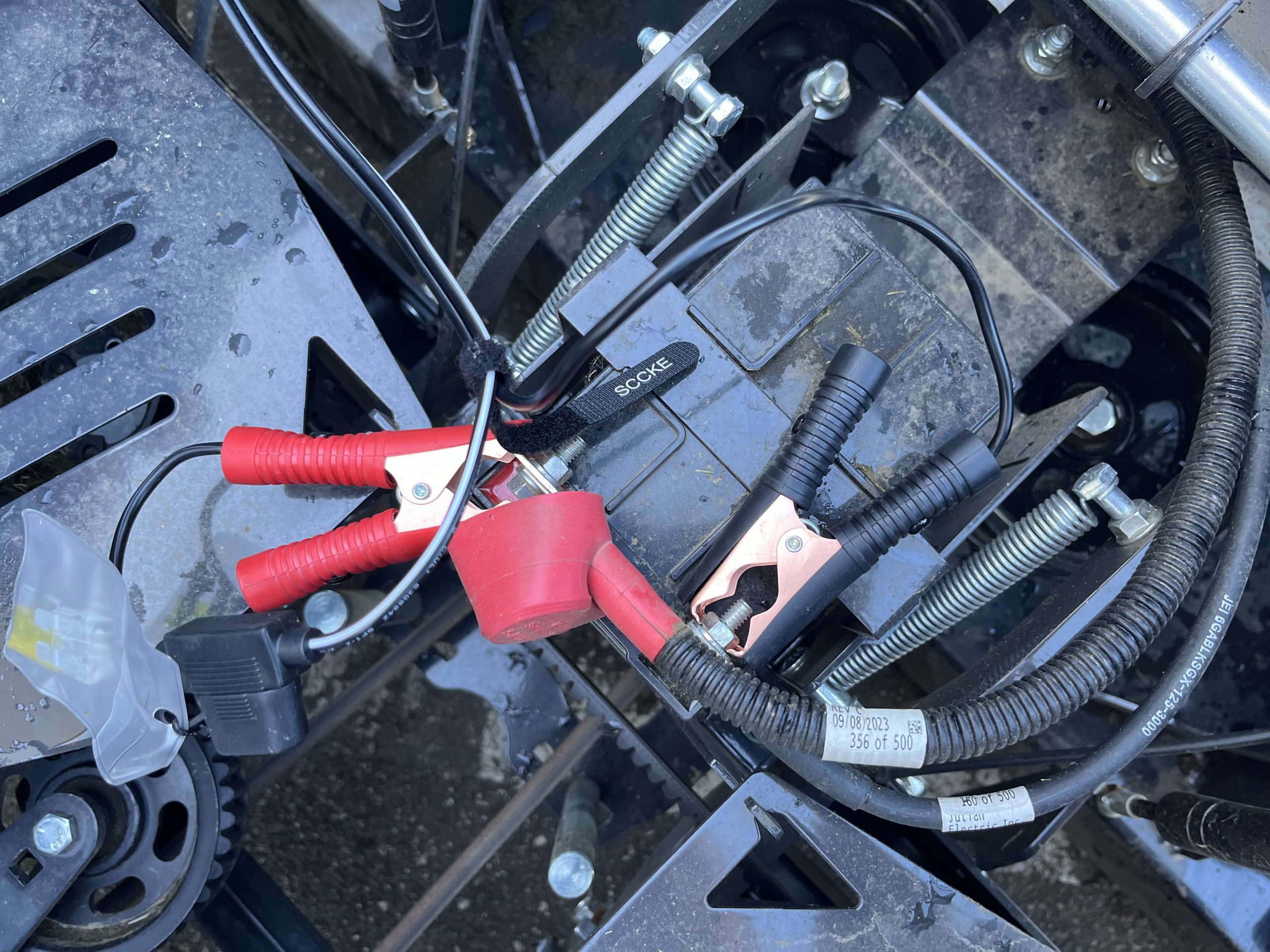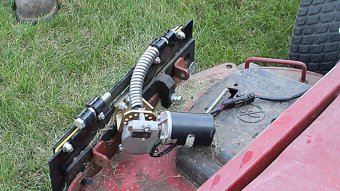 The electric motor, which rests on top of the mower deck, takes all of the work out of operating the chute blocker and is powered by the existing mower battery.