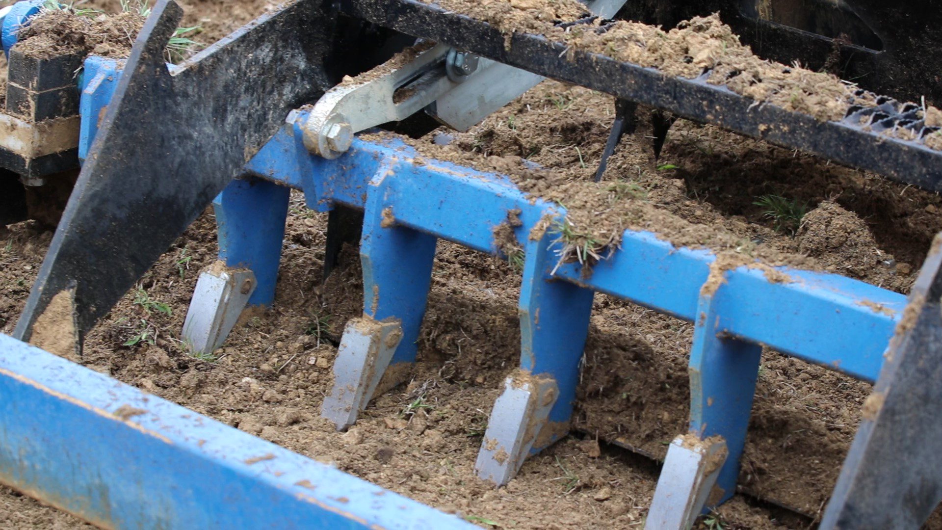 KAGE Innovation’s skid steer land plane simplifies the process of switching from scarifying to land leveling by eliminating the need for hydraulics or tools. The land plane with rippers loosens hard packed dirt or gravel and allows for feathering simply by backing up – or by pressing down the mechanically-activated quick rip bar – which raises and lowers the ripper teeth.
