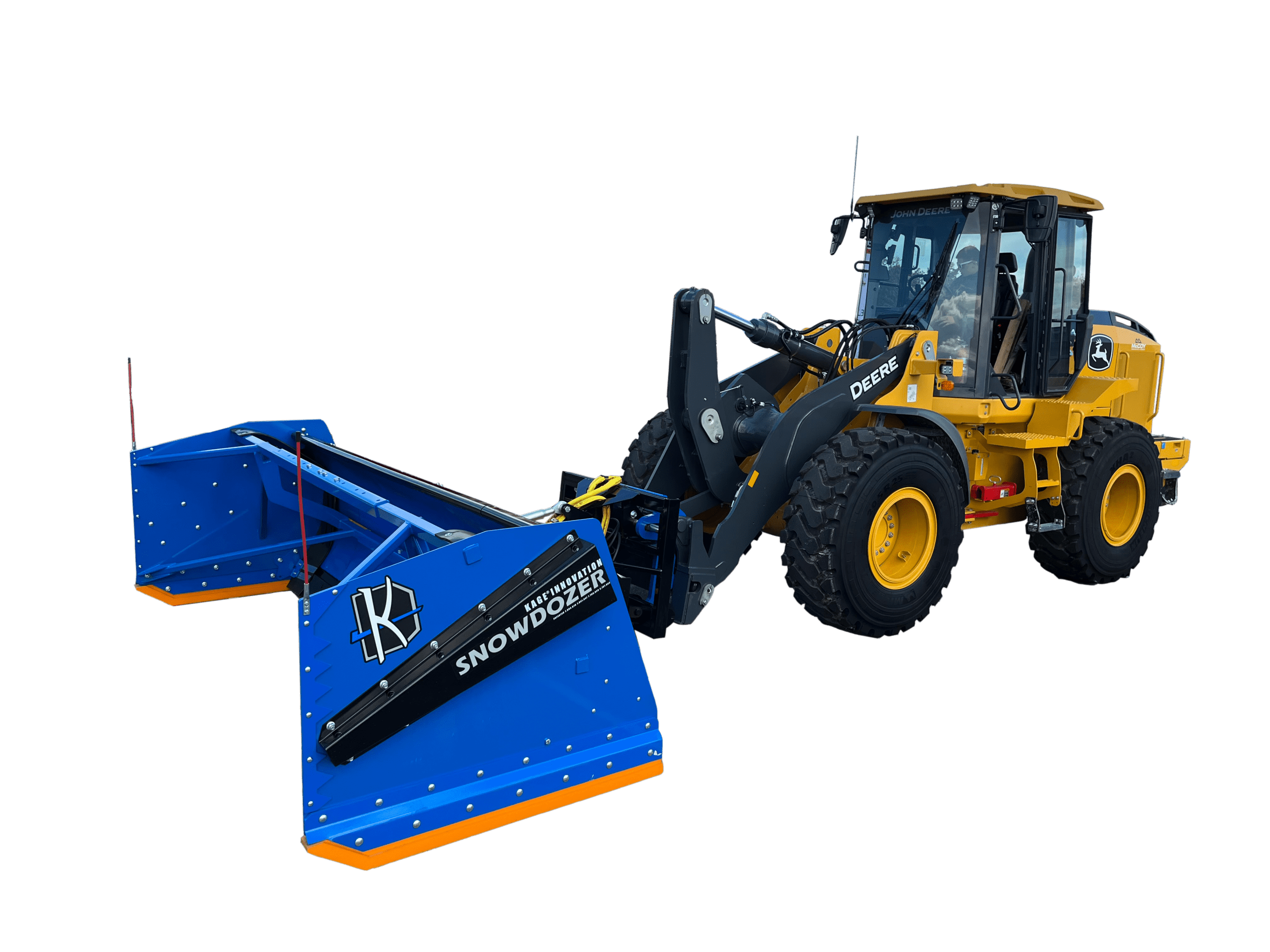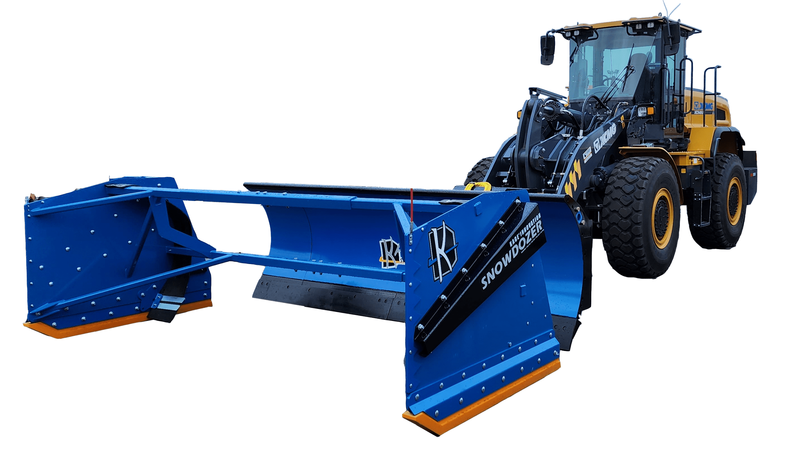 The KAGE SnowDozer system combines snow plowing and snow pushing into one wheel loader machine or tractor, and one operator. The simple advantages angle plowing and snow pushing are brought together seamlessly by being able to reliably switch between the two from the cab, in seconds.