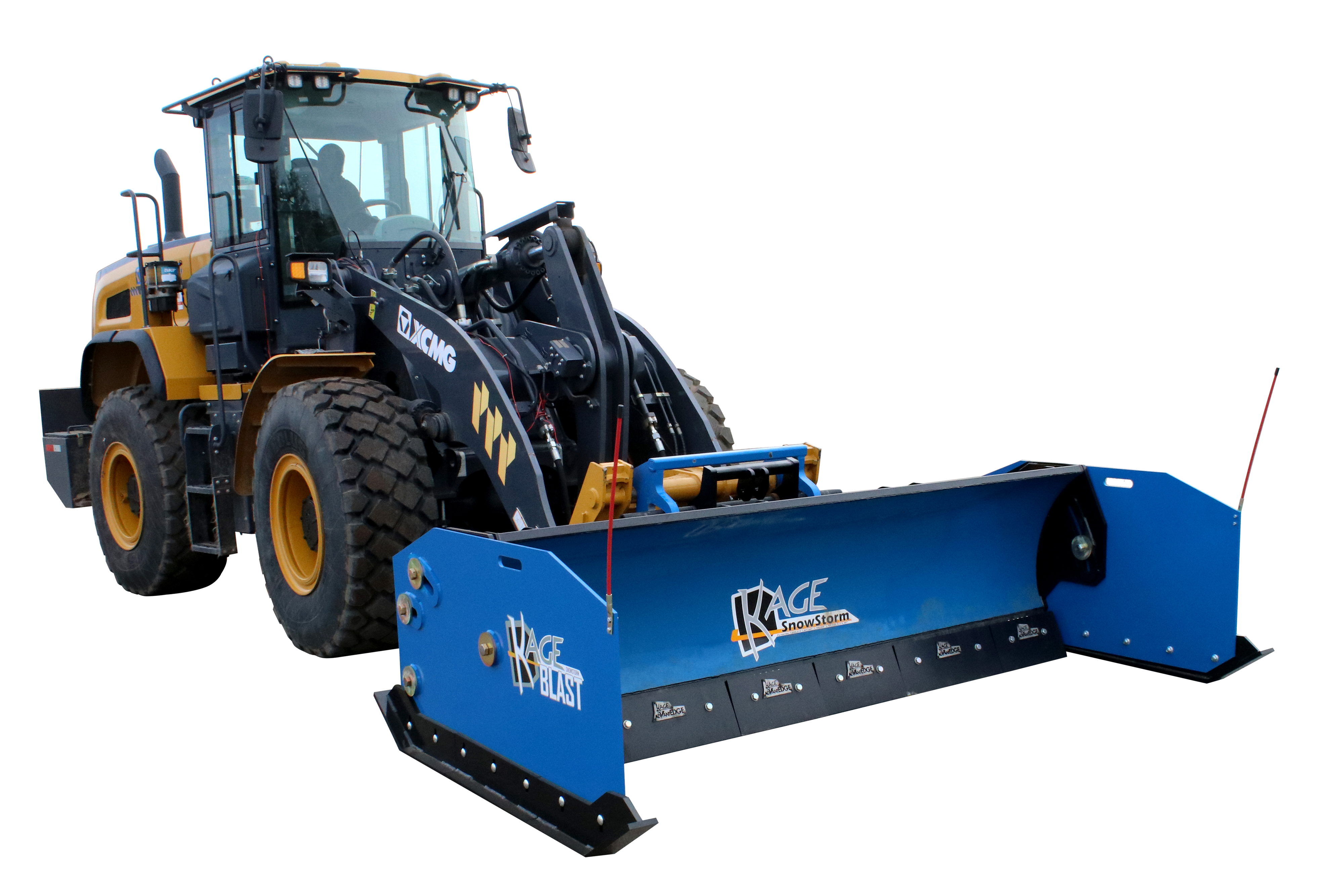 The KAGE® SnowStorm BLAST Steel snow pusher for 15k-30k lb wheel loaders and 100+ hp ag tractors expands the forward thinking of KAGE’s hydraulic-free trip edge snow pushers to include steel shoes and a floating side panel. This speed and safety-oriented snow pusher maximizes convenience and performance while minimizing maintenance. Simply hook up the box plow using a 3-point hitch, floating loader quick attach or bucket clamp and you’re good to go. No hoses needed!