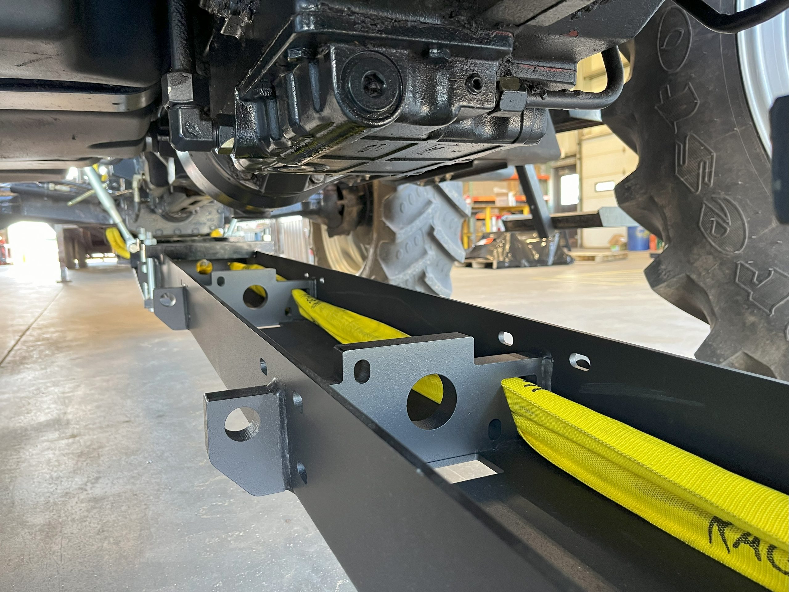 The first mounting point for the KAGE Under-Hitch tractor undercarriage is to the tractor’s front bumper.