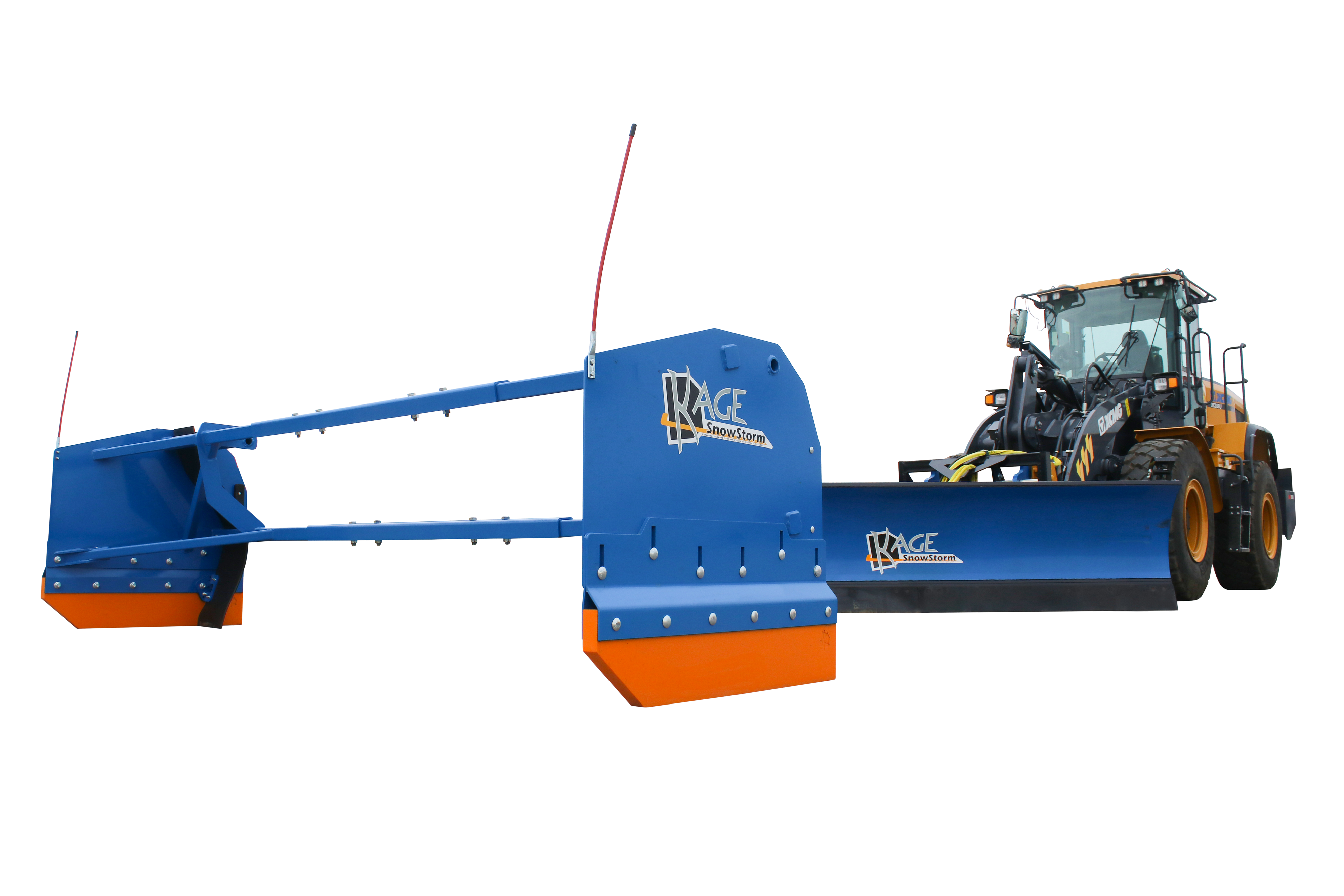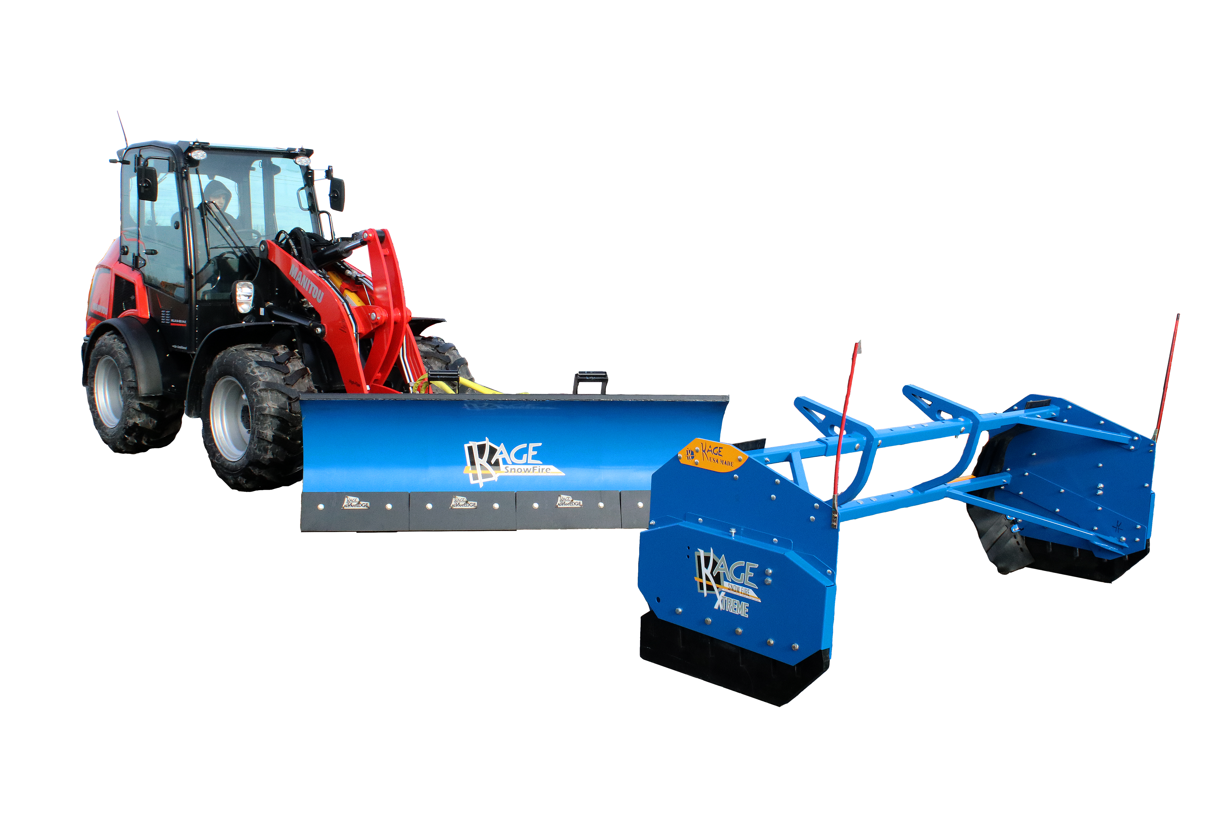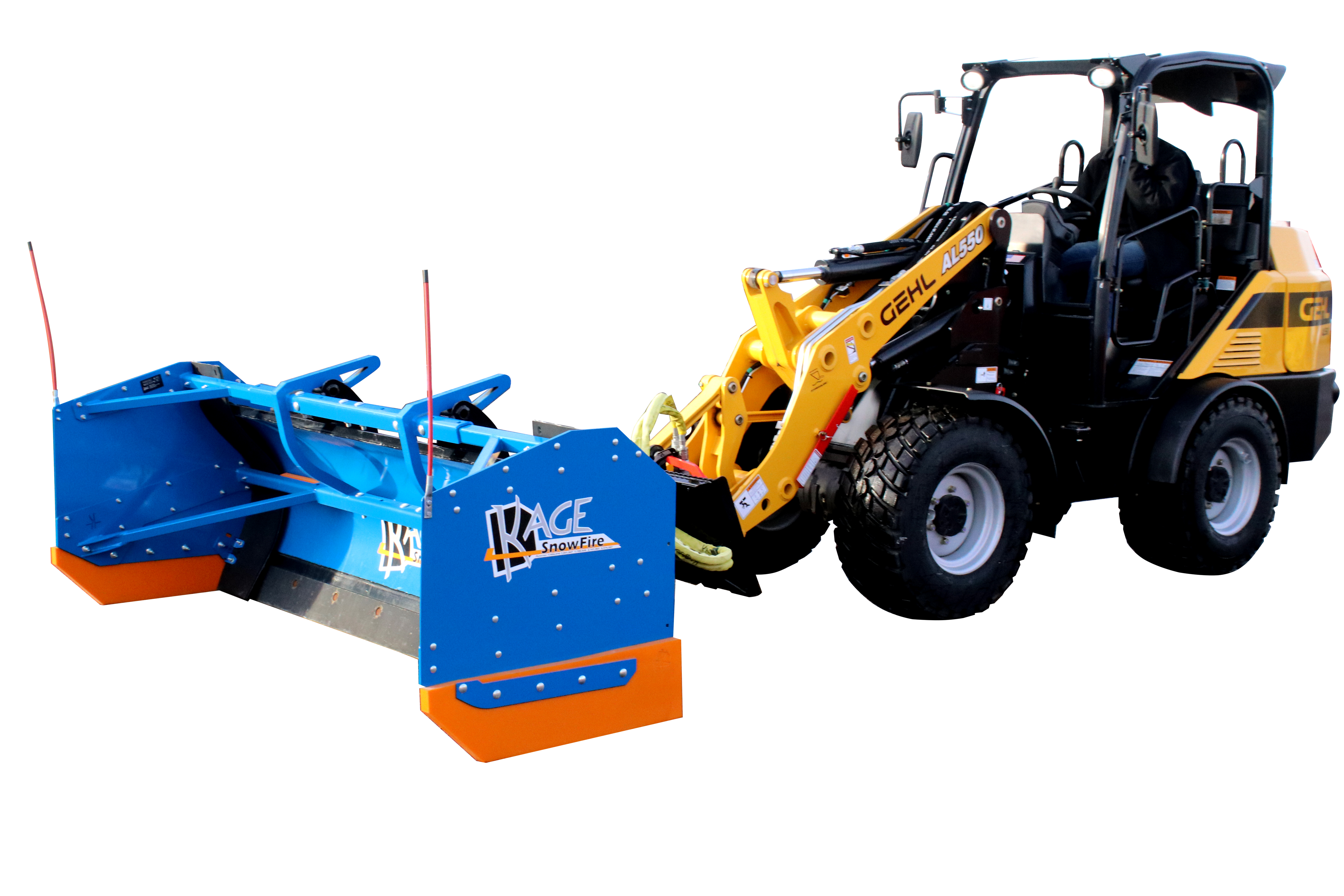 KAGE is the proud inventor and patent holder of the 2-in-1 plow systems including the original wheel loader snow plow and pusher system attachment – the KAGE SnowFire – for up to 15K-pound loaders. KAGE also offers snow plow attachments for midsize wheel loaders (15k- to 30k pounds) and large wheel loaders (30k- to 50k-pounds). Its entry level wheel loader snow pushers are known as the SnowFire BLAST and SnowStorm BLAST. The BLAST pushers remove the need for hydraulic hoses yet offer all of the great float features available in its high end 2-in-1 systems. In 2024, KAGE also released its first loader snow plow with hydraulic wings, known as the SnowDozer Wing.