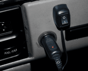 A standard smart switch is mounted to the lift cylinder of the wing plow, and automatically turns the laser on or off when the wing plow is deployed or retracted by the operator, respectively. This can also be overridden by the provided thumb switch.