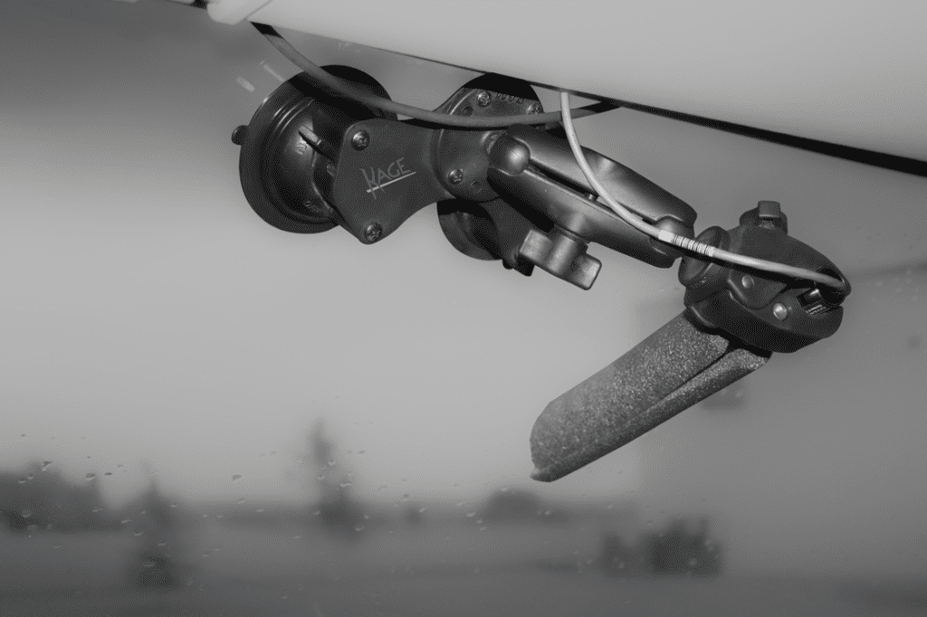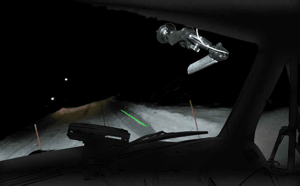 Using the provided suction cup mounts, the laser guide can be aimed to the perfect location in front of the vehicle. Since the WingLine mounts INSIDE the cab, it stays warm and the windshield wipers keep the laser beam unobstructed by snow and ice! A simple refraction tube (pictured on the right below) eliminates any reflection from the windshield.